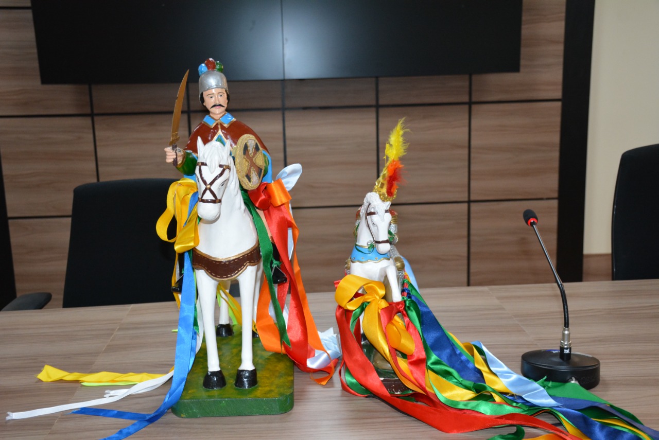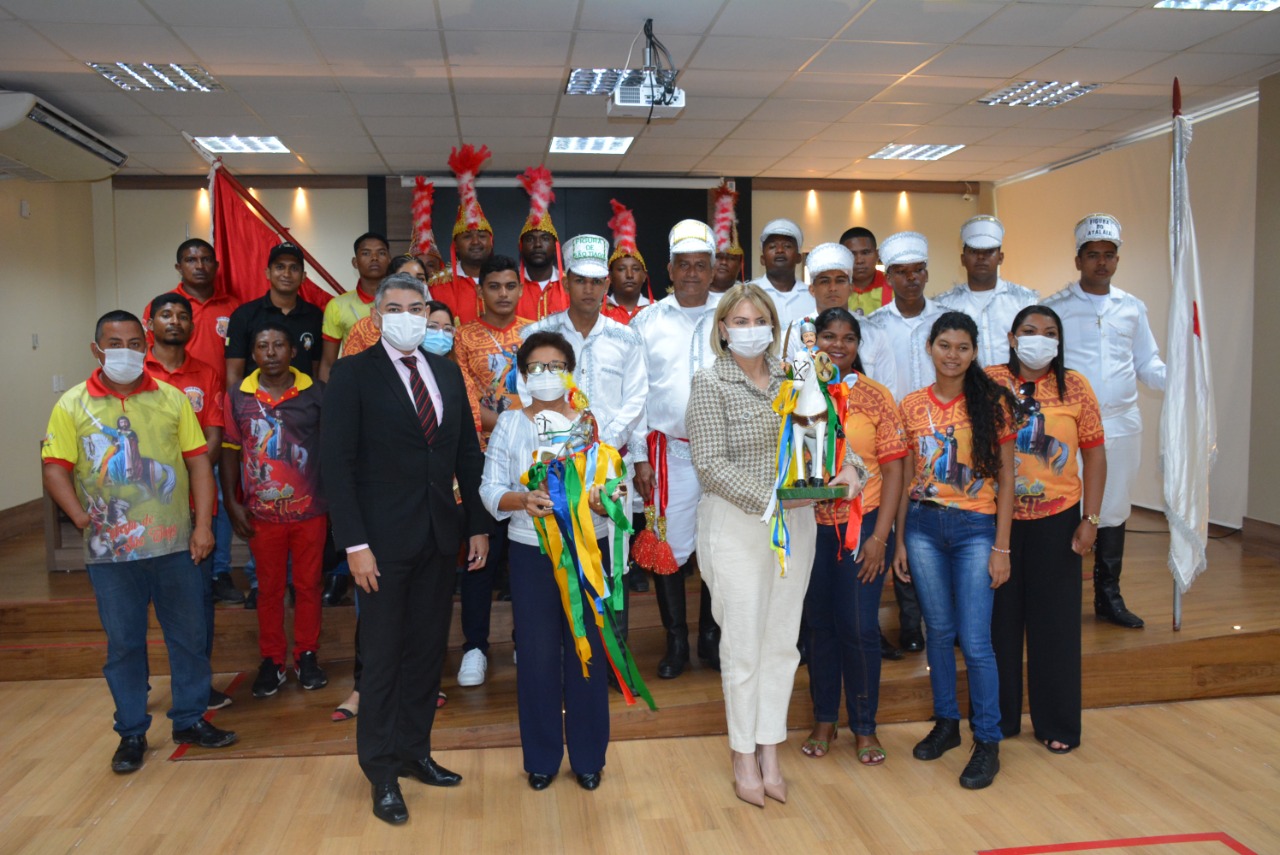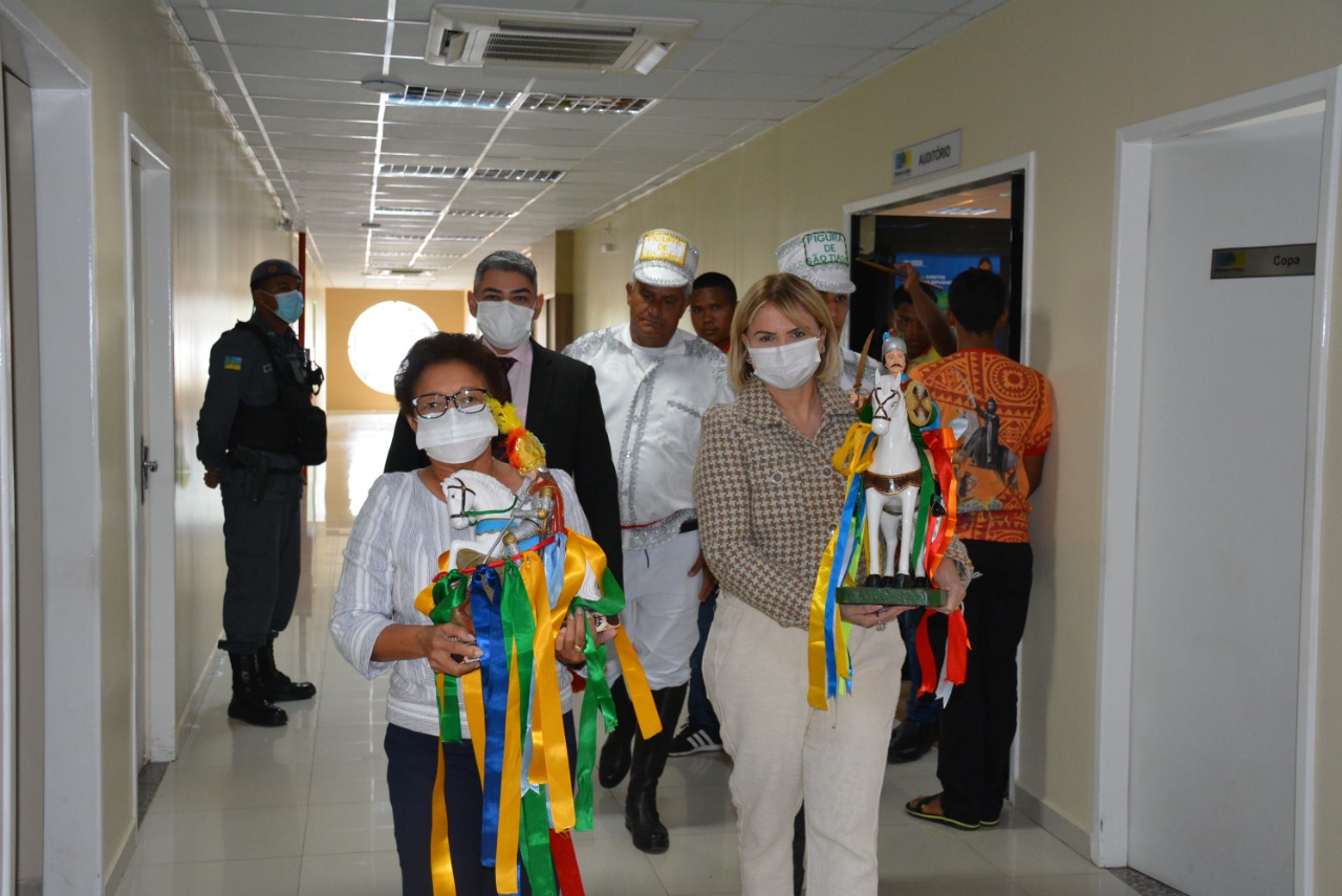 Como parte do roteiro de visitas às instituições do Estado, nesta quarta-feira (13), a procuradora-geral de Justiça do Ministério Público do Amapá (MP-AP), Ivana Cei, em companhia da subprocuradora-geral de Justiça para Assuntos Jurídicos, Clara Banha e do chefe de gabinete, em exercício, promotor de Justiça Paulo Celso Ramos, receberam as imagens de São Tiago e São Jorge na Procuradoria-Geral de Justiça – Promotor Haroldo Franco. O cortejo é feito pela comitiva do Instituto Cultural da Festa de São Tiago, uma das maiores manifestações histórico-culturais do Amapá.